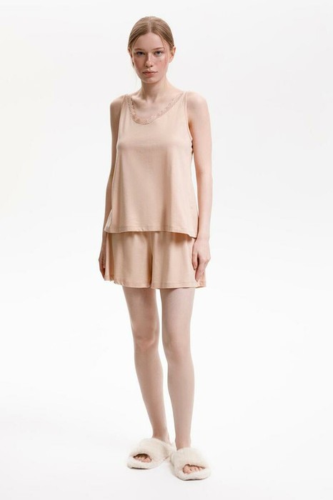 Легкий комплект нюдово-бежевого оттенка выполнен из хлопка с нежнейшим модалом. Свободный крой топа декорированный эластичным кружевом и мягкий пояс шорт обеспечивают легкость и свободу движений.