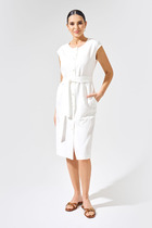 Платье с круглым вырезом и короткими рукавами из плотного набивного трикотажа интерлок. Модель с трапециевидной юбкой и боковыми карманами.