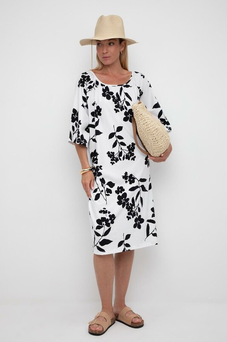Легкое свободное платье с круглым вырезом на сборке, короткими рукавами из набивного трикотажа супрем.