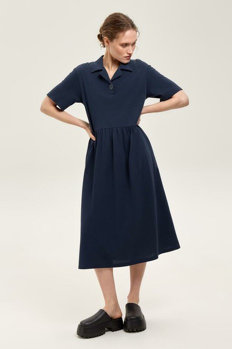 Летнее платье в стиле поло выполненно из премиального трикотажа пике. Свободный силуэт, наличие боковых карманов придают изделию спортивный и одновременно романтический стиль. 100% хлопок в составе обеспечивает комфорт в жаркую погоду. Глубокий чернильный цвет является основой всех морских коллекций.