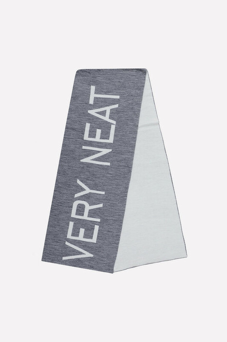 Двусторонний шарф из полушерсти с вывязанным рисунком в виде надписи VERY NEAT. Длина - 200 см, ширина - 40 см. Связан гладью. Украшен фирменной этикеткой.
