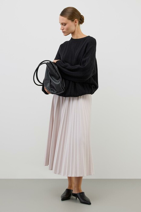 Юбка гофре, выполненная из высококачественного трикотажного полотна DOUBLE FACE, отличается особой легкостью и шелковистой текстурой благодаря силиконовой обработке ткани. Она элегантно струится, создавая ощущение легкости и воздушности. Мелкие складки визуально удлиняют силуэт, подчеркивая женственность.