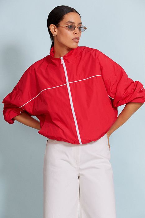 Ветровка выполнена из тонкого шуршащего хлопка. Изделие на подкладке-сетке. Центральная застежка на молнию. Отрезная горизонтальная кокетка на полочке и на спинке, в которую вставлен декоративный кант. Спущенная линия плеча. Длинный объемный рукав. Низ рукава на резинке. Низ изделия на резинке. Горловина-стойка.