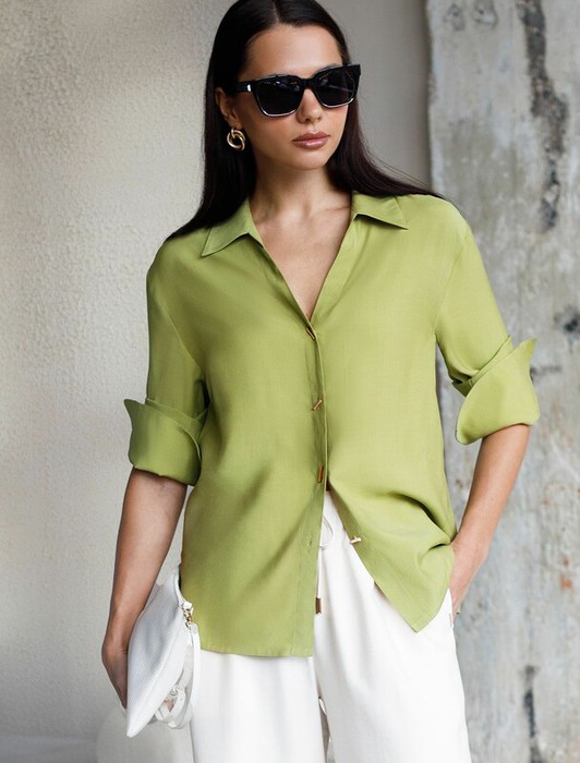 Блузка светло-оливкового цвета сочетает в себе комфорт и элегантность благодаря материалу из вискозы с лиоцеллом. Аккуратный отложной воротник подчеркивает утонченность образа, а продолговатые металлические пуговицы золотистого цвета добавляют выразительный акцент и придают блузке благородный вид. Широкие манжеты на рукавах привлекают внимание и делают силуэт современным. Спущенная линия плеча формирует расслабленный, но стильный внешний вид, что идеально для тех, кто ценит индивидуальность и уверенность в деталях. Крой продуман так, чтобы подчеркивать достоинства фигуры и на больших размерах, создавая гармоничный силуэт без лишних усилий. Ткань из вискозы с добавлением лиоцелла обеспечивает приятные ощущения и отличную посадку, струится на теле и охлаждает в жаркую погоду. Рубашка легко впишется как в деловой гардероб, так и в повседневный стиль, позволяя выглядеть безупречно независимо от ситуации.
