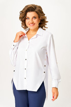 Свободный крой блузки и спущенная линия плеча дарят ощущение легкости и непринужденности, делая образ одновременно женственным и современным. Широкие рукава средней длины гармонично дополняют образ и идеально подходят для полных рук, обеспечивая комфорт, свободу движений и уверенность. Аккуратная застежка на маленькую пуговицу добавляет утонченности, а круглый вырез красиво обрамляет шею, создавая аккуратную линию декольте.