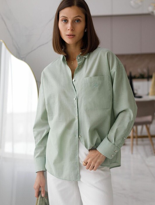 Свободная блузка  светло-оливкового цвета с отложным воротником из хлопка станет отличным выбором для тех, кто ценит комфорт и стиль. Благодаря натуральной ткани,  блузка приятная к телу и подходит для ежедневной носки. Материал — 100% хлопок — гарантирует хорошую воздухопроницаемость и ощущение свежести даже в жаркие дни. Удлиненный  крой создает современный силуэт, который отлично смотрится в повседневных образах. Базовая модель легко впишется в любой гардероб и станет универсальным решением для самых разных случаев.Ткань держит форму после стирки, что делает уход за вещью простым и удобным. Карман на груди добавляет функциональности и делает образ более интересным. Натуральная структура материала не раздражает кожу, а сама блузка освежает внешний вид благодаря своему лаконичному дизайну и приятной расцветке.