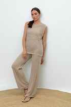 Брюки - дудочки выполнены из плотного джерси. Высокая посадка и стрелки зрительно увеличивают рост и визуально стройнят. Модель дополнена сзади эластичным поясом на резинке и боковыми разрезами по низу штанин. Лаконичные брюки станут идеальным дополнением базового гардероба. С легкостью дополнят строгий офисный стиль и повседневный аутфит.