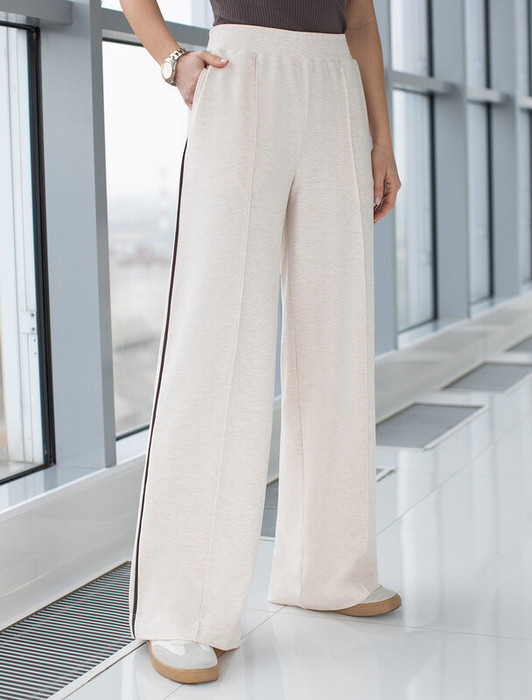 Брюки выполнены из эластичного футера двухнитки. Изделие свободного кроя дополнено трендовыми лампасами кофейного цвета и боковыми карманами. Эластичный пояс на резинке с потайным шнуром. Модель сочетается в костюме с джемпером D49.086