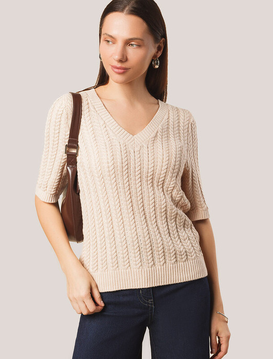 Джемпер фактурной вязки выполнен из хлопка с добавлением кашемира. Модель с V-вырезом с вывязанным орнаментом цепи. Мягкая и очень приятная пряжа совершенно не колется, сохраняет тепло при этом не перегревая, гарантируя безупречный комфорт.