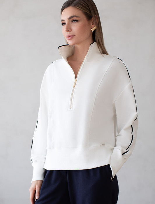 Джемпер с воротом на молнии выполнен из эластичного футера двухнитки. Модель умеренно свободного кроя. По рукавам и воротнику кант из футера контрасного цвета. Изделие дополнено золотистым логотипом бренда. Сочетается в костюме с брюками D44.141, D44.142, шортами D48.009 и юбкой-шортами D46.041. Правила ухода: использовать жидкое моющее средство (гель для стирки), добавлять к нему кислородный пятновыводитель для цветных вещей, и салфетки (защита от окрашивания). Стирка при 30 градусах, отжим на максимальных оборотах.