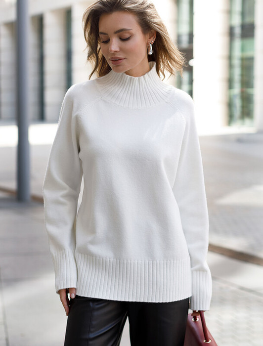 Джемпер с воротом стойка выполнен из мягкой пряжи с кашемиром. Модель свободного силуэта с рукавом реглан будет стильно сочетается с брюками и джинсами. Мягкая пряжа очень приятная к телу, поддержит комфорт на протяжении всего дня, при этом не перегревая. Сочетается в костюме с брюками D38.013, D38.012 и юбкой D36.016