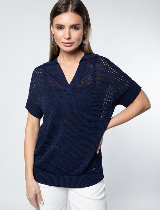 Джемпер-поло связан фактурным узором из тонкой пряжи на основе вискозы с лиоцеллом. Глубокий V- вырез подчеркивает линию шеи. Гладкое и достаточно прочное изделие хорошо держит форму, в нем будет комфортно даже в жаркое время года. Можно носить с бежевым бельем или хлопковым топом. Для самых смелых – на голое тело.