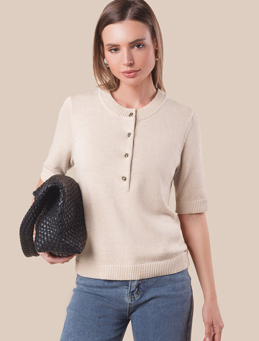 Джемпер тонкой вязки выполнен из хлопка с добавлением кашемира. Модель с круглым вырезом дополнена золотистыми пуговицами. Мягкая и очень приятная пряжа совершенно не колется, сохраняет тепло при этом не перегревая, гарантируя безупречный комфорт.