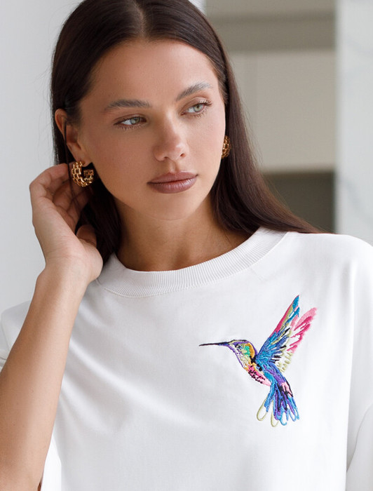 Совместные покупки Сургут Женская одежда Футболки — Vilatte Футболка из эластичного футера с авторским принтом D49.095 белый_колибри