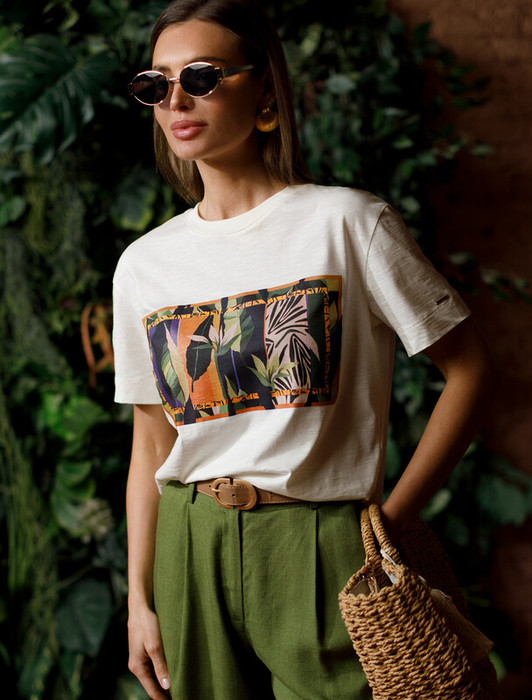 Совместные покупки Сургут Женская одежда Футболки — Vilatte Футболка из фактурного полотна с авторским принтом D49.071 молочный_exot