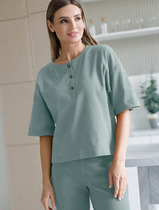 Футболка выполнена из фактурного трикотажа в рубчик. Модель свободного кроя дополнена пуговицами с логотипом бренда. Благодаря мягкой хлопковой ткани в рубчик, футболка очень приятная к телу.  Эластан в составе гарантирует комфорт и формоустойчивость изделия. Сочетается в костюме с шортами D48.007 и брюками D44.121