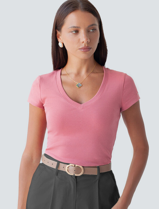 Облегающая футболка с V-образным вырезом цвета фуксия создаст утонченный образ. Идеальная базовая модель для вашего гардероба! Глубокий V-образный вырез подчеркивает линию шеи и зрительно удлиняет силуэт. Футболка выполнена из хлопка с добавлением эластана, которая мягко облегает контуры тела, подчеркивая достоинства фигуры. Универсальный вариант для создания стильных повседневных образов.