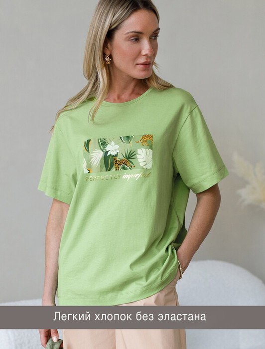 Совместные покупки Сургут Женская одежда Футболки — Vilatte Футболка из премиального хлопка с авторским принтом D49.089 фисташковый_