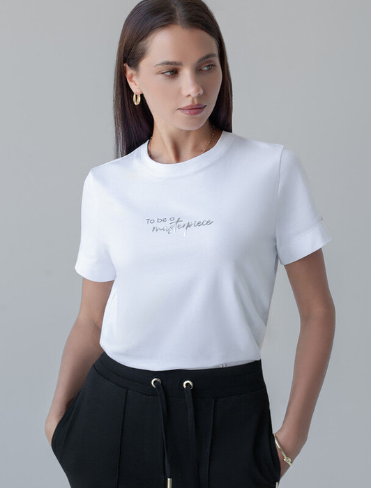 Футболка выполнена из премиального хлопка.Принт "леопард" нанесен фактурными красками с устойчивым покрытием. Наличие эластана в составе гарантирует комфорт и формоустойчивость. Изделие дополнено фирменным металлическим логотипом бренда.