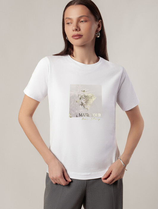 Совместные покупки Сургут Женская одежда Футболки — Vilatte Футболка из премиального хлопка с авторским принтом D49.110 белый_own st