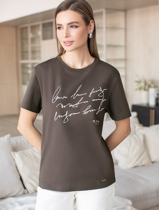 Совместные покупки Сургут Женская одежда Футболки — Vilatte Футболка из премиального хлопка с авторским принтом D49.983 кофе_be diff