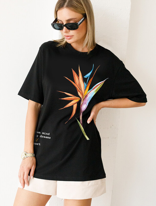 Футболка свободного кроя выполнена из премиального хлопка.  Лаконичный принт нанесен красками с устойчивым покрытием и россыпью сияющих страз. Перевод: «Own your magic - Твори свою магию» Наличие эластана в составе гарантирует абсолютный комфорт и долговечность изделия. Модель дополнена металлическим логотипом бренда.