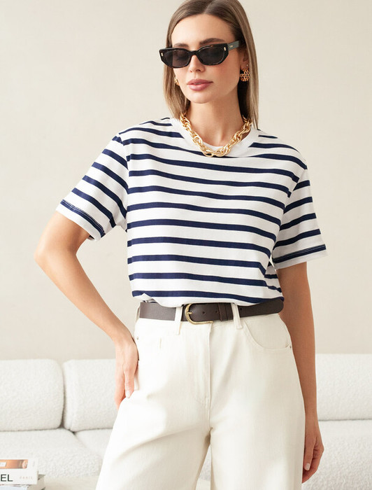 Футболка выполнена из премиального хлопка. Наличие эластана гарантирует абсолютный комфорт и долговечность изделия. Модель в полоску предлагаем сочетать с однотонными вещами базовой палитры. Изделие дополнено металлическим логотипом бренда.