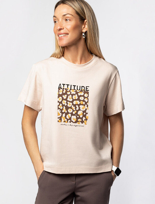 Совместные покупки Сургут Женская одежда Футболки — Vilatte Футболка из премиального хлопка с принтом фольгой D49.098 бежевый_attitu