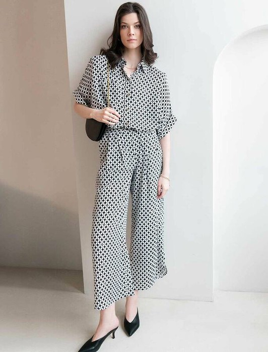 Кюлоты с разрезами выполнены из тонкого лиоцелла. Модель дополнена двумя карманами по бокам и эластичным поясом на резинке. Приятная на ощупь тонкая ткань охлаждает кожу и успокаивающе действует на нее, а крой не ограничивает свободу движений. Графичный принт поддерживает легкий блеск ткани.