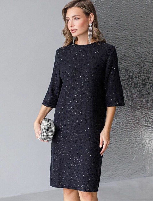 Эффектное платье черного цвета с широкими рукавами средней длины выполнено из хлопковой пряжи с вкраплением сияющих пайеток, что придает особую изысканность. Платье связано изнанкой, пряжа отличается легкостью и приятной текстурой, совершенно не колется, обеспечивает комфорт даже при длительном использовании, а натуральные волокна поддерживают оптимальный температурный баланс. Крой полуприлегающий, подчеркивает женственный силуэт, а круглый ворот, манжеты на рукавах и по низу  гармонично завершают дизайн, создающий аккуратный образ. Благодаря универсальному крою, платье подойдет девушкам и женщинам пышных форм и больших размеров, длина миди подходит на низкий и высокий рост. Мерцающее полотно добавляет особого шарма вашему образу, делая его уместным как на праздник, так и для повседневного выхода. Новый год, вечеринка или любое другое мероприятие пройдут ярко — сияющие пайетки создают ощущение праздника в каждом движении. Это стильное платье поможет чувствовать себя уверенно на любом мероприятии в осенний и з
