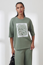 Свитшот выполнен из эластичного футера двухнитки. Изделие дополнили лаконичным принтом стразами в тон изделия. Расслабленный стиль поддерживает спущенная линия плеча, свободный силуэт и разрезы по бокам. Модель сочетается в костюме с брюками D44.135, D44.136, D44.137 и юбкой D46.034