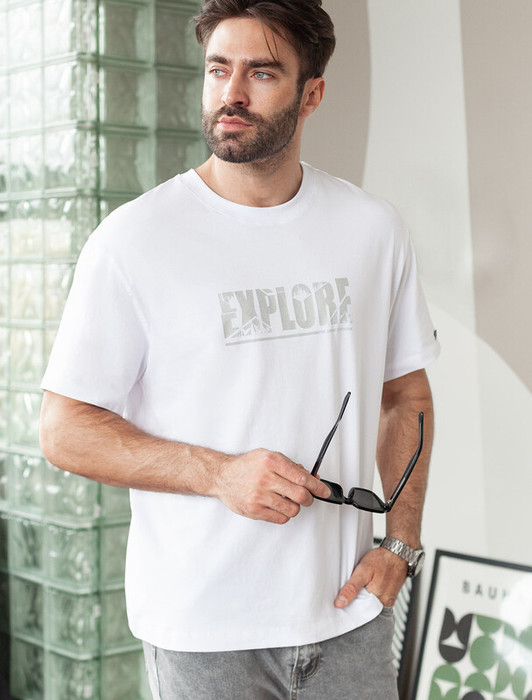 Совместные покупки Сургут Мужская одежда Футболки — 22.03 Vilatte Свободная футболка с авторским принтом U49.048 белый_explore гео