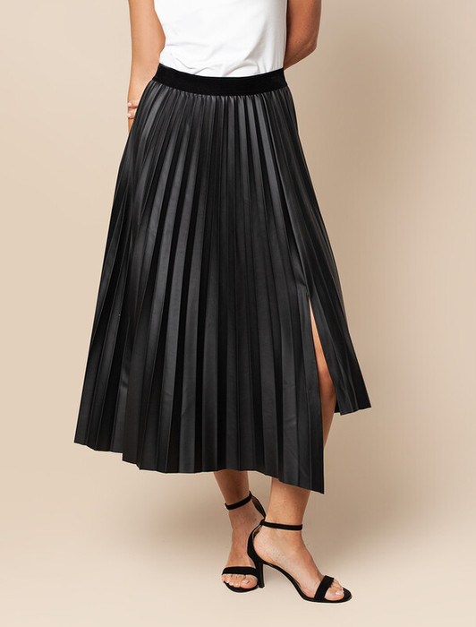 Асимметричная плиссированная юбка выполнена из мягкой эко-кожи. Посадка на талии акцентирована поясом из эластичной вельветовой ленты. Полуматовое покрытие смотрится утонченно и легко поможет создать вечерний образ, а также в повседневных образах станет отличным компаньоном к свитерам и высоким сапогам.  На уровне ассиметричной линии спереди находится разрез, открывающий ноги. Атласное внутреннее покрытие обеспечивает идеальный комфорт при носке с колготками.