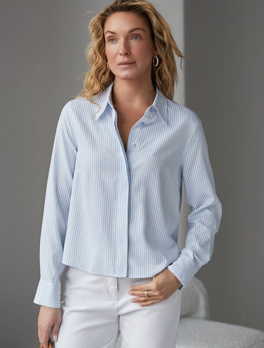 Совместные покупки Сургут Женская одежда Блузки, рубашки — 22.03 Vilatte Укороченная блузка из эластичного хлопка D29.322 белый-голубой