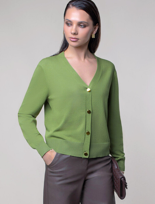 Жакет тонкой вязки выполнен из вискозы с нейлоном. Модель с V- вырезом дополнена золотистыми пуговицами и фирменным металлическим логотипом бренда. Мягкая пряжа приятная к коже позволяет носить изделие как первый слой, а также рекомендуем использовать как кардиган в многослойных образах поверх топа или платья.
