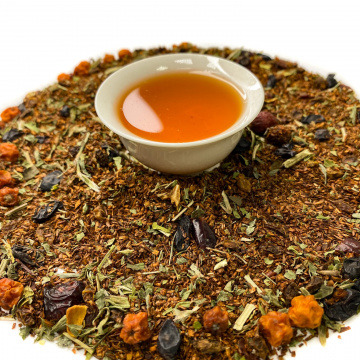 Облепиха богата витамином В, благодаря чему способствует нормализации деятельности нервной системы, улучшению памяти, органов зрения, а благодаря содержанию витаминов А и Е оказывает антиоксидантное действие. Облепиха укрепляет иммунную систему, поэтому она незаменима для профилактики простудных заболеваний. Шиповник- поливитаминное растение, обладает желчегонным, противовоспалительным действиями. Мелисса бодрит и укрепляет организм. Кроме того в этом чае содержатся такие витамины, как: Ройбуш - С, А, Е, Р. Облепиха - А, С, В1, В2, В3, В6, В9, Е, РР, Н. Мята -А, C, B1, B2, B3 (PP), B5, B6 и B9), минералы. Мелисса - В1, В2, С, -каротин. Шиповник - витамин P (до 9 %), PP, B1, B2, К, Е. Рябина - С, Е, В1, В2, Р, РР, К; Барбарис - (А, С, Е, группы В)