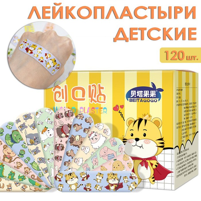 Пластыри с рисунками станут настоящей находкой для детей!В упаковке 120 штук, каждый из которых украшен ярким и красочным рисунком. Всего в коллекции 12 различных изображений, так что ваш ребенок будет радоваться каждому новому пластырю!Эти пластыри не только прекрасно справляются с защитой маленьких порезов и царапин, но и создают приятную атмосферу и повышают настроение ребенка, в отличие от обычных скучных и однообразных пластырей.Ультратонкие лейкопластыри на полиуретановой водонепроницаемой основе надежно защищает рану во время купания. Размер пластыря 72*19 мм.Пластырь хорошо приклеивается к коже, удаляется, не причиняя боли и не оставляя следов клея.Каждый пластырь изготовлен из мягкого и гипоаллергенного материала, который не вызывает раздражения даже на самой чувствительной коже.