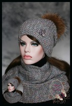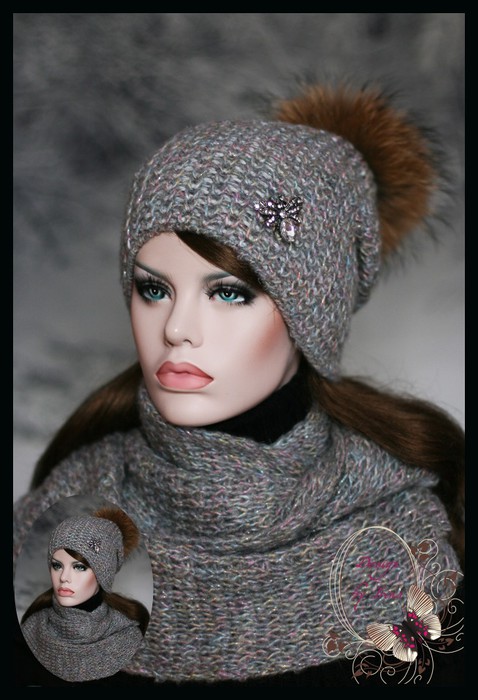 Вязаный комплект «Dragonfly»(сер.)с помпоном из натурального меха енота..