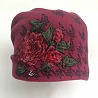 Модная женская шапка-бандана с драпировкой складок сзади. Сбоку украшена яркой двухцветной аппликацией в виде цветка розы, выполненной вышивкой гладью шелковыми нитями, и изящным рисунком "гусиная лапка" из черных мелких страз .
