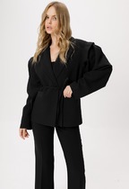 Жакет-бомбер "оверсайз" со спущенным плечом, воздушным рукавом, по низу рукава бантовые складки. По переду застежка на молнию, воротник "шаль". Перед жакета на кокетке, по низу заложены складки. Спинка на кокетке, по низу резинка.