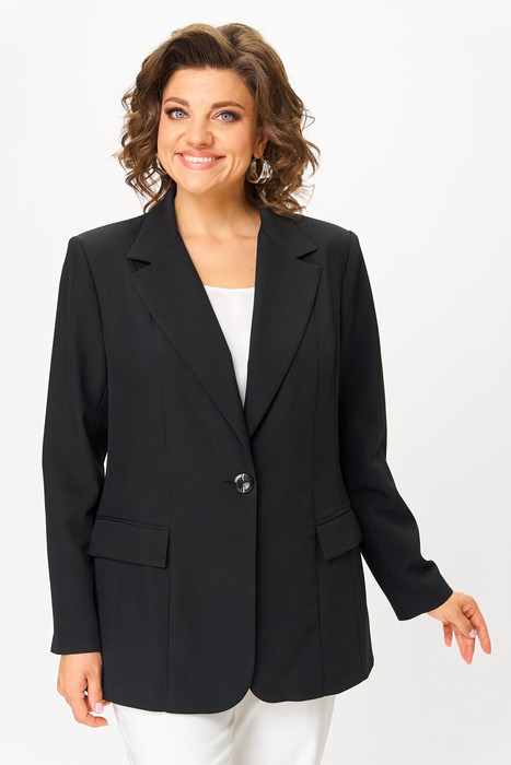Жакет прямого силуэта, выполнен из однотонной ткани, жакет на подкладке. Полочка жакета с центральной застежкой на петлю пуговицу. Полочка с вертикальными рельефами и прорезными карманами с клапанами. Горловина V-образной формы с отложными лацканами и воротником пиджачного типа. Спинка со средним швом и вертикальными рельефами. Рукав втачной, двухшовный. Жакет на плечиках.