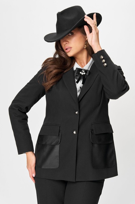 Жакет с застёжкой спереди на петли и пуговицы, с пиджачным воротником и втачными двухшовными рукавами. По переду из экокожи выполнены боковые накладные карманы с двойными клапанами, спинка со швами.
