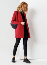 Жакет прямого силуэта, длиной ниже линии бедра, на подкладке, с плечевыми накладками, с двубортной застежкой на петли и пуговицы. Воротник пиджачного типа с отложными лацканами. Перед с талиевыми вытачкам и подрезными бочками, переходящими на спинку, с прорезными карманами в рамку с клапаном. Спинка с средним швом. Рукав втачной двухшовный длинный.