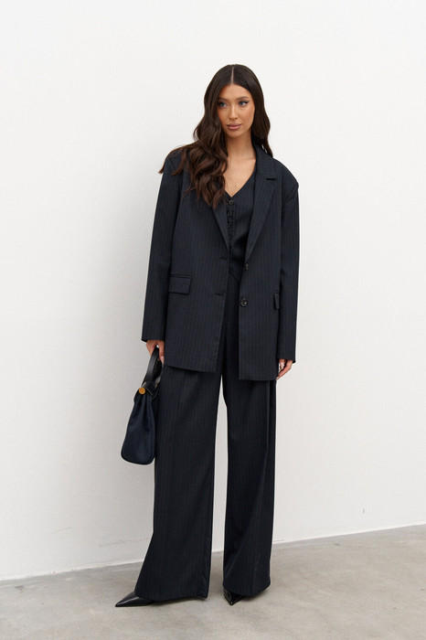 Жакет прямого свободного кроя выполнен из костюмной ткани синего цвета в тонкую полоску. Характеристики: прямой свободный крой, подкладка, подплечники, воротник с остроугольным лацканом, застежка центральная на петлю - пуговицу, по переду функциональные карманы с клапаном, рукав втачной, по низу рукава нашиты пуговички, спинка со средним швом, в среднем шве шлица 47 см. Длина по спинке 77, длина рукава 62 см.