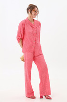 Жакет двубортный. Выполнен из полотна серо-перламутрового цвета с блеском. Полуприлегающий силуэт, подклад, отрезной бочок, приталиевые выточки по передней части. Воротник с остроугольным лацканом. Застёжка петли-пуговицы (декорированы тканью основного изделия). Карманы по переду внизу с клапаном без застёжки (функциональные). Рукав втачной, на рукаве петли-пуговицы (нефункциональные, декорированы тканью основного изделия), длина рукава от края горловины 80 см. Длина спинки жакета 72 см.