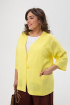 Жакет прямого свободного кроя выполнен из костюмной ткани. Характеристики: прямой свободный крой, подкладка, подплечники, воротник с остроугольным лацканом, застежка центральная на петлю - пуговицу, по переду функциональные карманы с клапаном, рукав втачной, по низу рукава нашиты пуговички, спинка со средним швом, в среднем шве шлица 48 см. Длина по спинке 77, длина рукава 62 см.