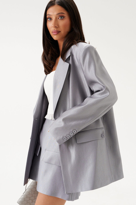 Жакет прямого свободного кроя выполнен из костюмной ткани. Характеристики: прямой свободный крой, подкладка, подплечники, воротник с остроугольным лацканом, застежка центральная на петлю - пуговицу, по переду функциональные карманы с клапаном, рукав втачной, по низу рукава нашиты пуговички, спинка со средним швом, в среднем шве шлица 48 см. Длина по спинке 77, длина рукава 62 см.