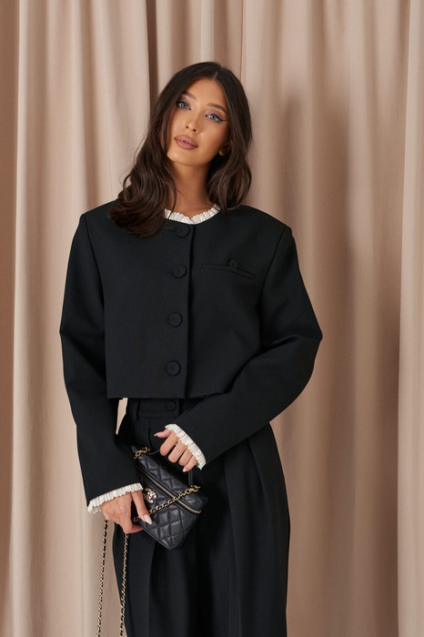 Жилет выполнен из текстильного полотна черного цвета. Полуприталеный силуэт,подклад, овальная горловина, талиевые выточки по передней и задней части изделия, грудные выточки Воротник отложной с лацканом. Застёжка центральная на петли-пуговицы. Карманы по переду внизу накладные с клапаном (функциональные). Длина спинки жилета 44 см.