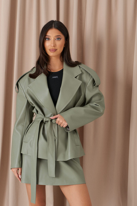 Жакет прямого кроя выполнен из эко-кожи эвкалиптового цвета. Характеристики: прямой крой, покладка, подплечники, отложной воротник с остроугольным лацканом, застежка центральная на петли пуговицы, по линии талии шлевки, в комплекте пояс из ткани основного изделия, рукав втачной. По линии плеча погон с пуговицей, в среднем шве заднего полотна изделия шлица 17 см. В боковых швах изделия карманы. Длина по спинке 65 см, длина рукава 58 см.
