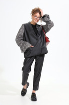 Жакет двубортный, полуприталленого силуэта. Выполнен из костюмной ткани кофейного цвета. Характеристика: отложной воротник с остроугольными геометрическими лацканами, вточной рукав, подклад, подплечники, талиевые выточки по переду, отрезная боковая планка, по переду изделия карманы-листочки, талиевые вытачки по спинке, брендированная подкладка. Длина рукава 24 см. Длина спинки от края горловины 72 см.